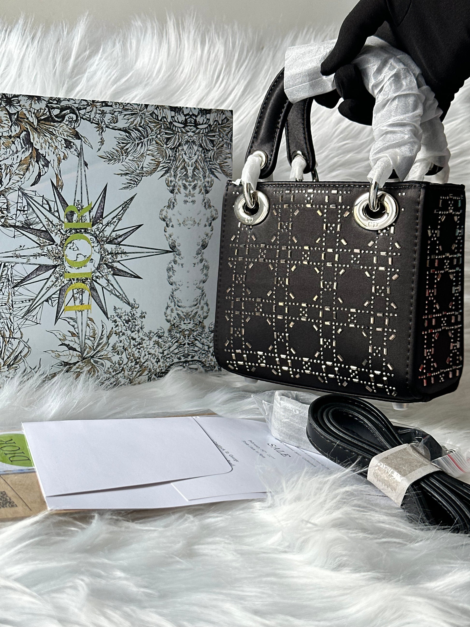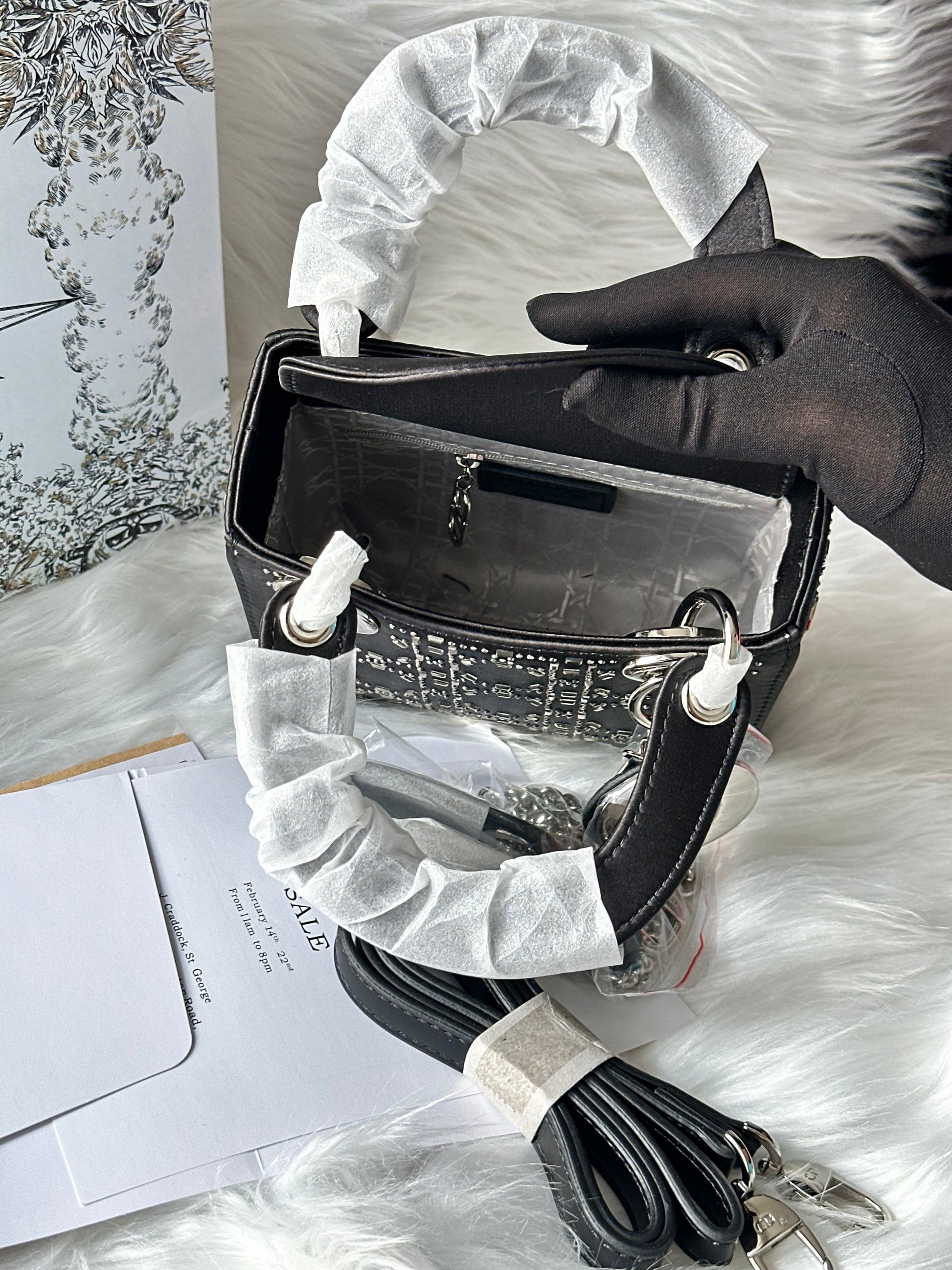 Step into timeless sophistication , a luxury-inspired handbag crafted to turn heads. Designed in a sleek matte black finish with intricate cut-out detailing, this structured tote embodies elegance and modern glamour. The polished top handles, complemented by bold silver hardware and statement charm accents, make it the perfect piece for both day and evening styling.Comes with two detachable straps.