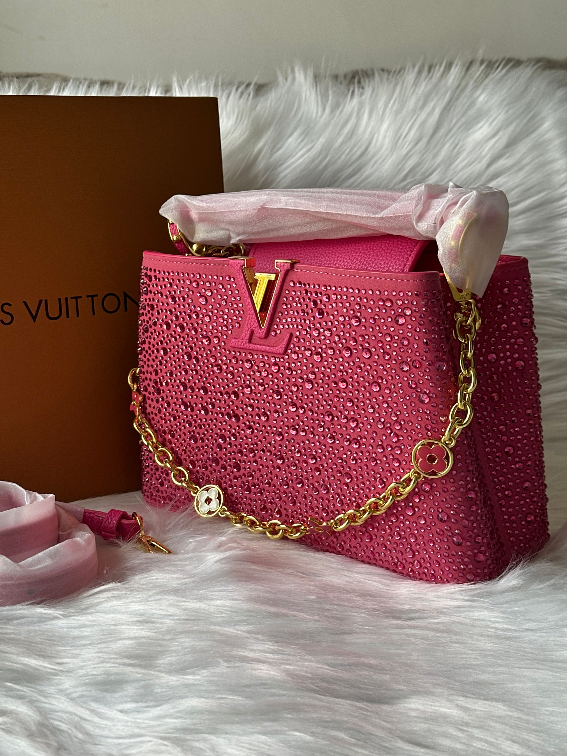 Dazzling and bold, this hot pink bag is embellished with sparkling crystals and paired with a chunky gold chain strap. Perfect for nights out or glam occasions, it’s a statement piece that shines effortlessly.