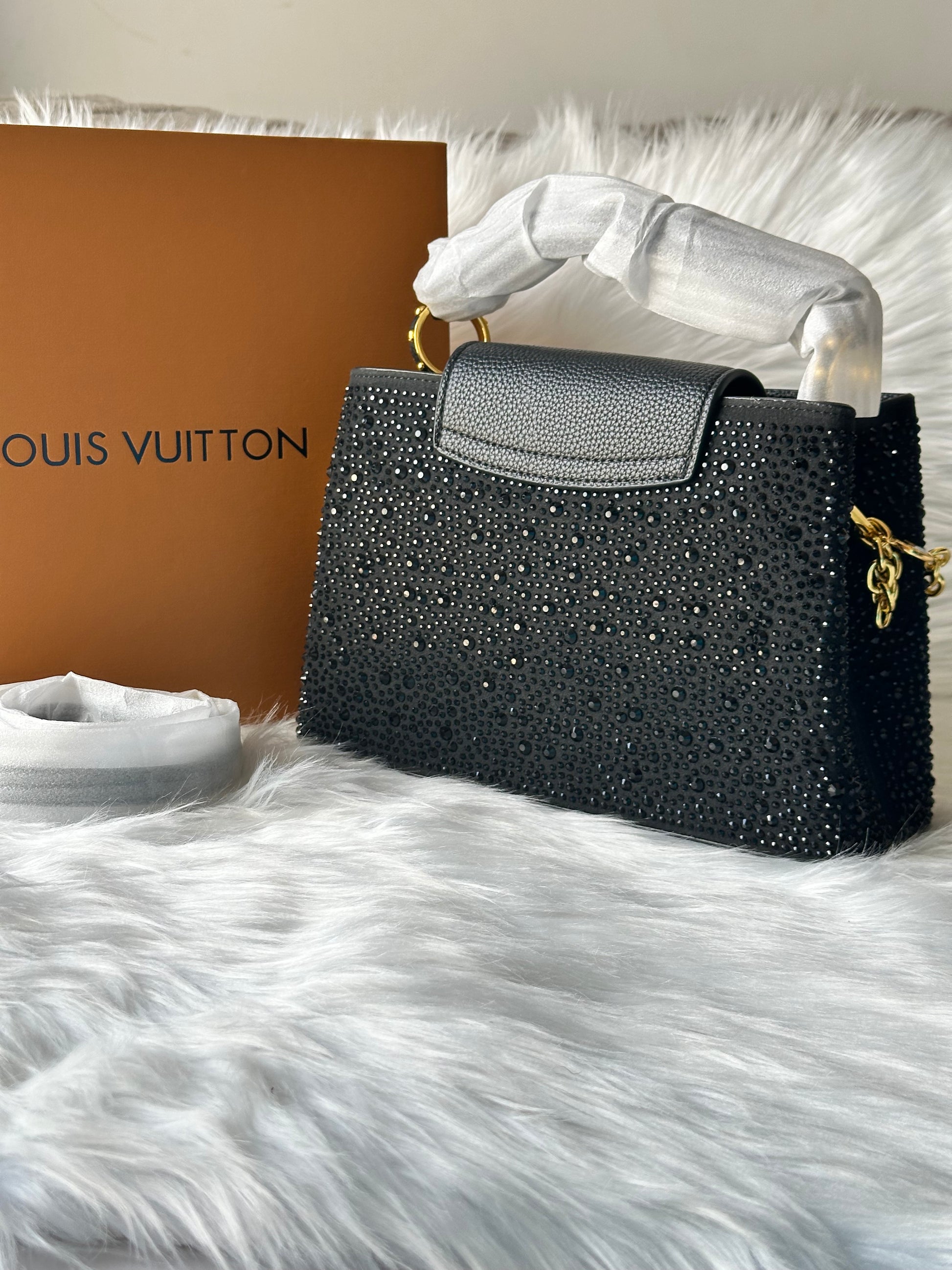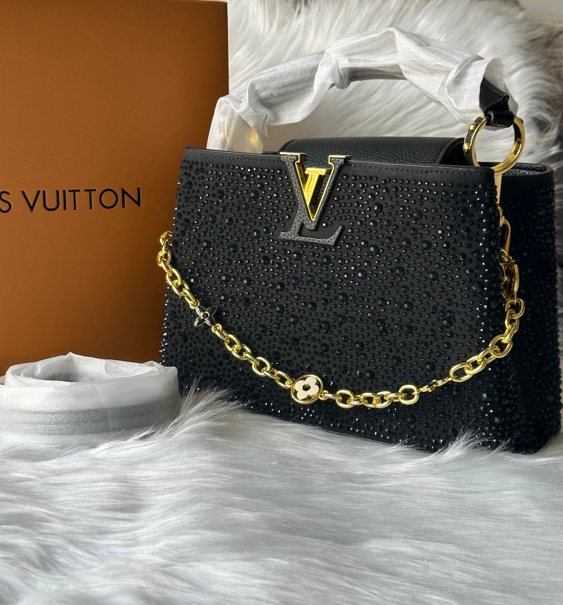 Elegant and striking, this black bag is embellished with sparkling crystals and finished with a chunky gold chain strap. A versatile piece that adds instant glamour to evening and special occasions.