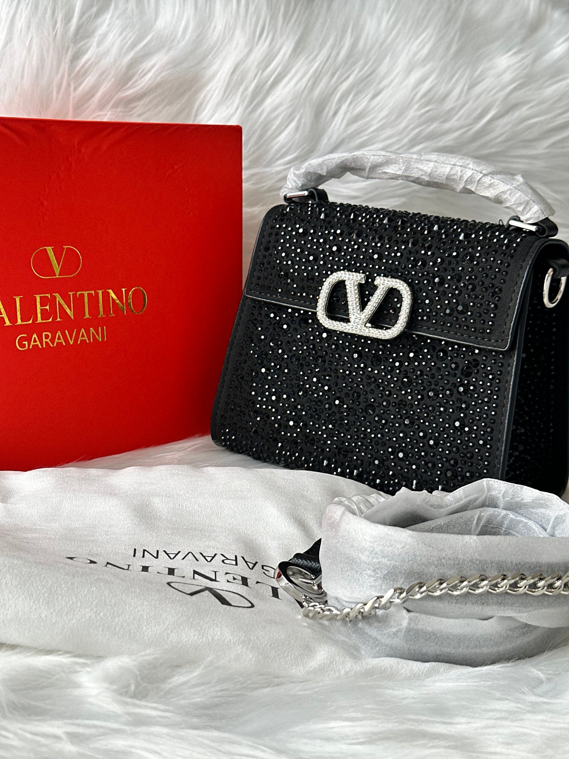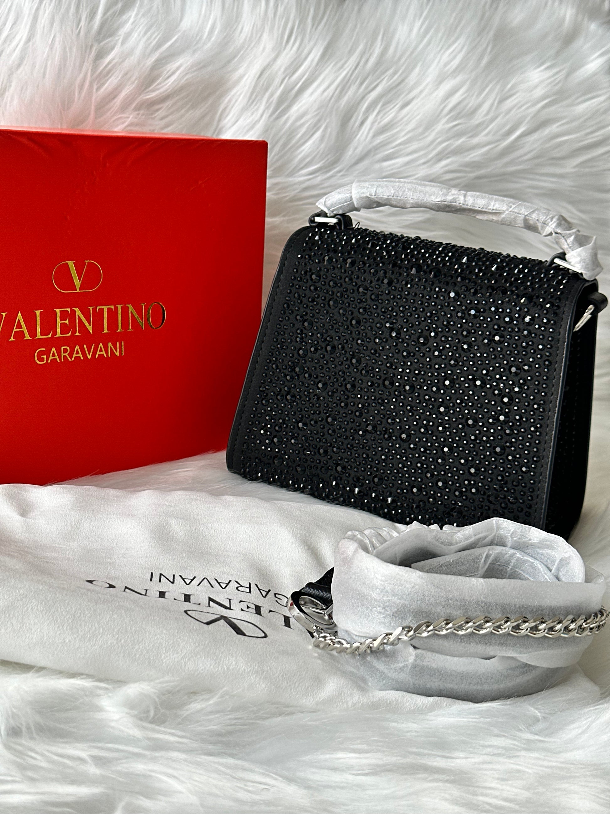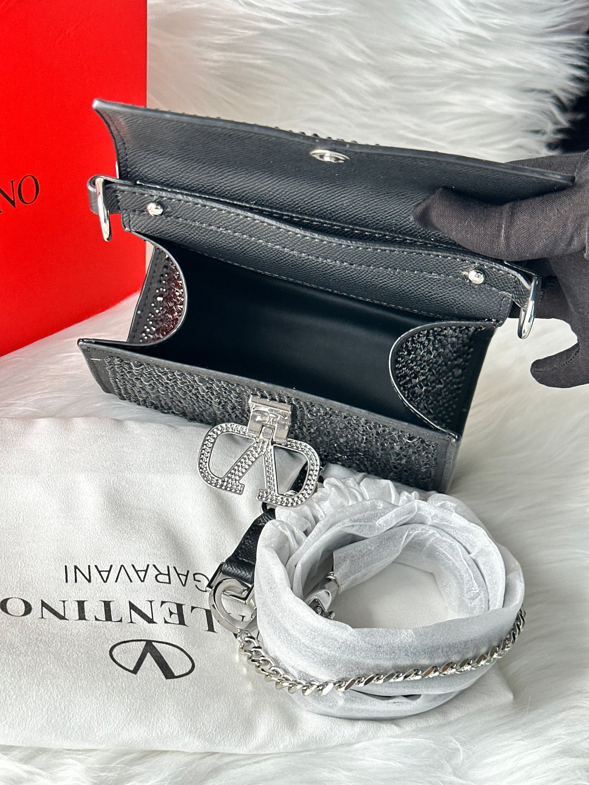 Make a bold statement with this bag, a black structured handbag embellished with sparkling crystals. Finished with a chic silver chain strap and signature hardware, it’s the perfect mix of elegance and edge—ideal for evenings out or elevating your everyday style