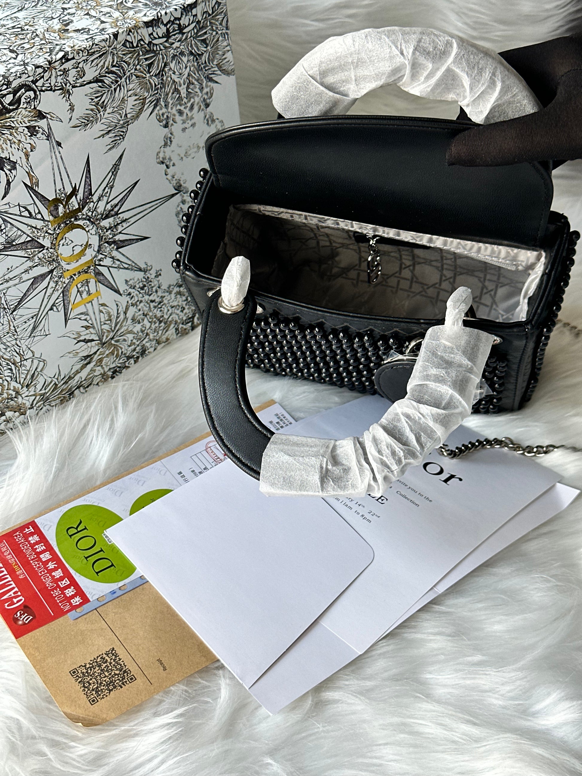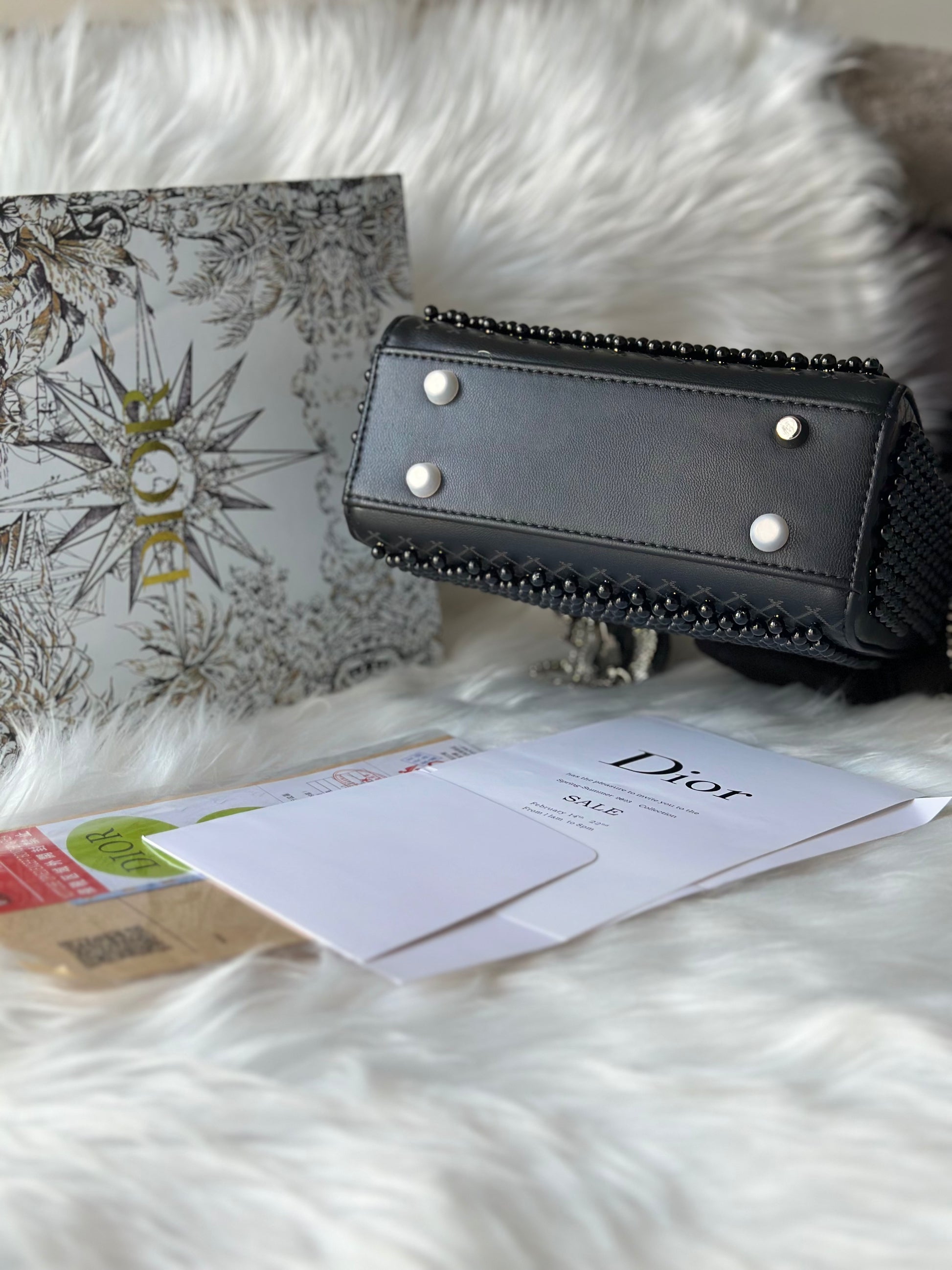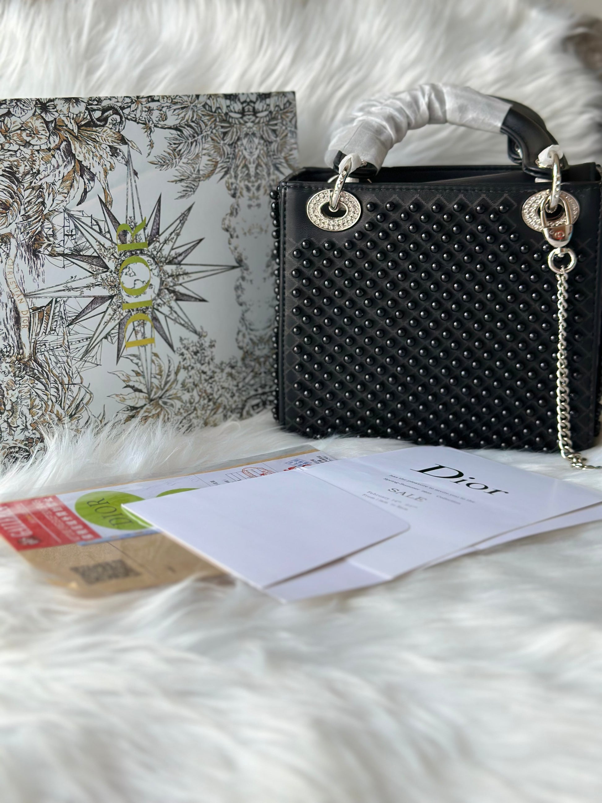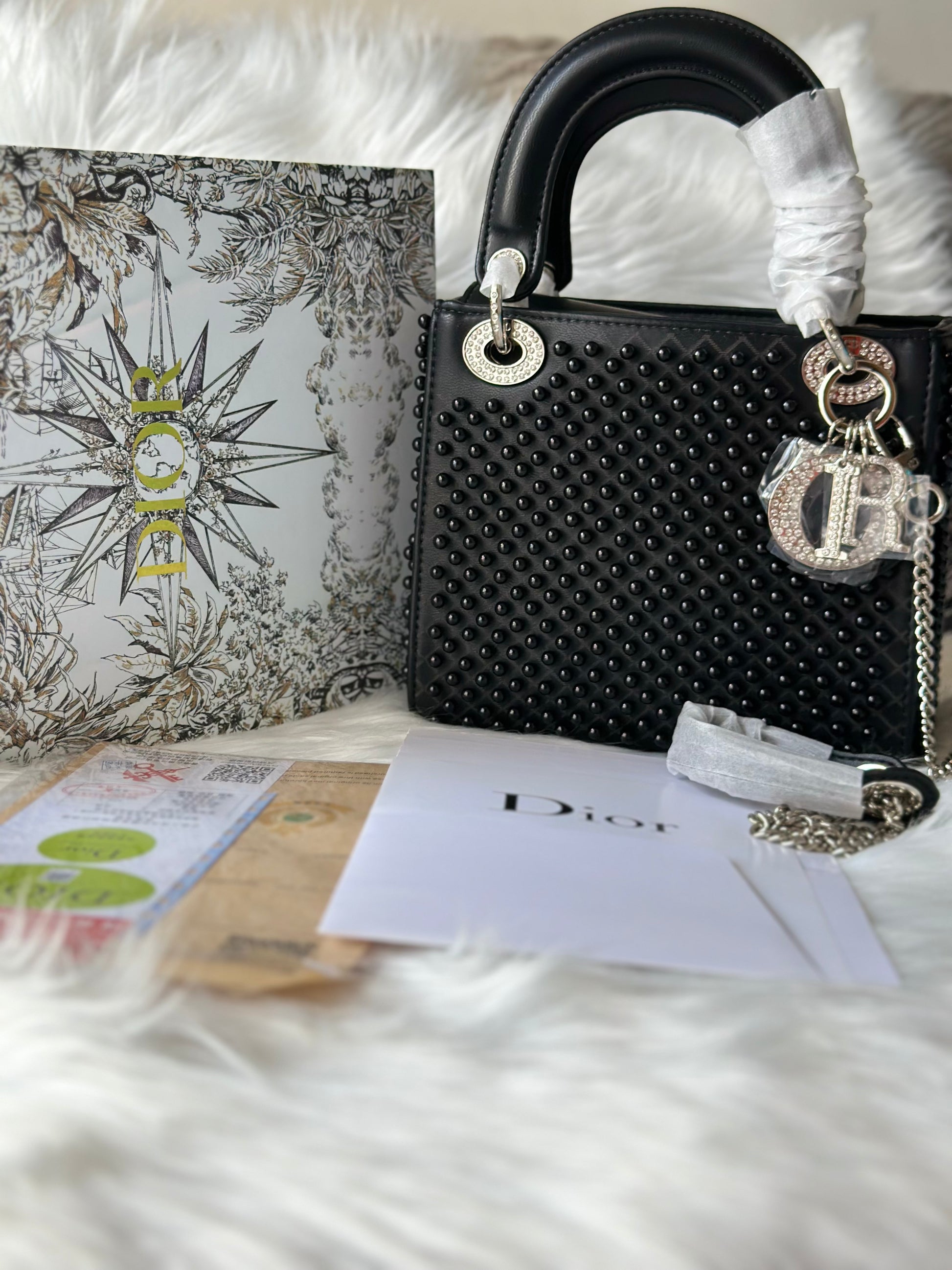 Crafted in smooth black leather with studded detailing beads, this structured silhouette strikes the balance between classic elegance and modern edge. Accented with polished silver hardware and finished with a detachable chain strap, it transitions effortlessly from day to evening.