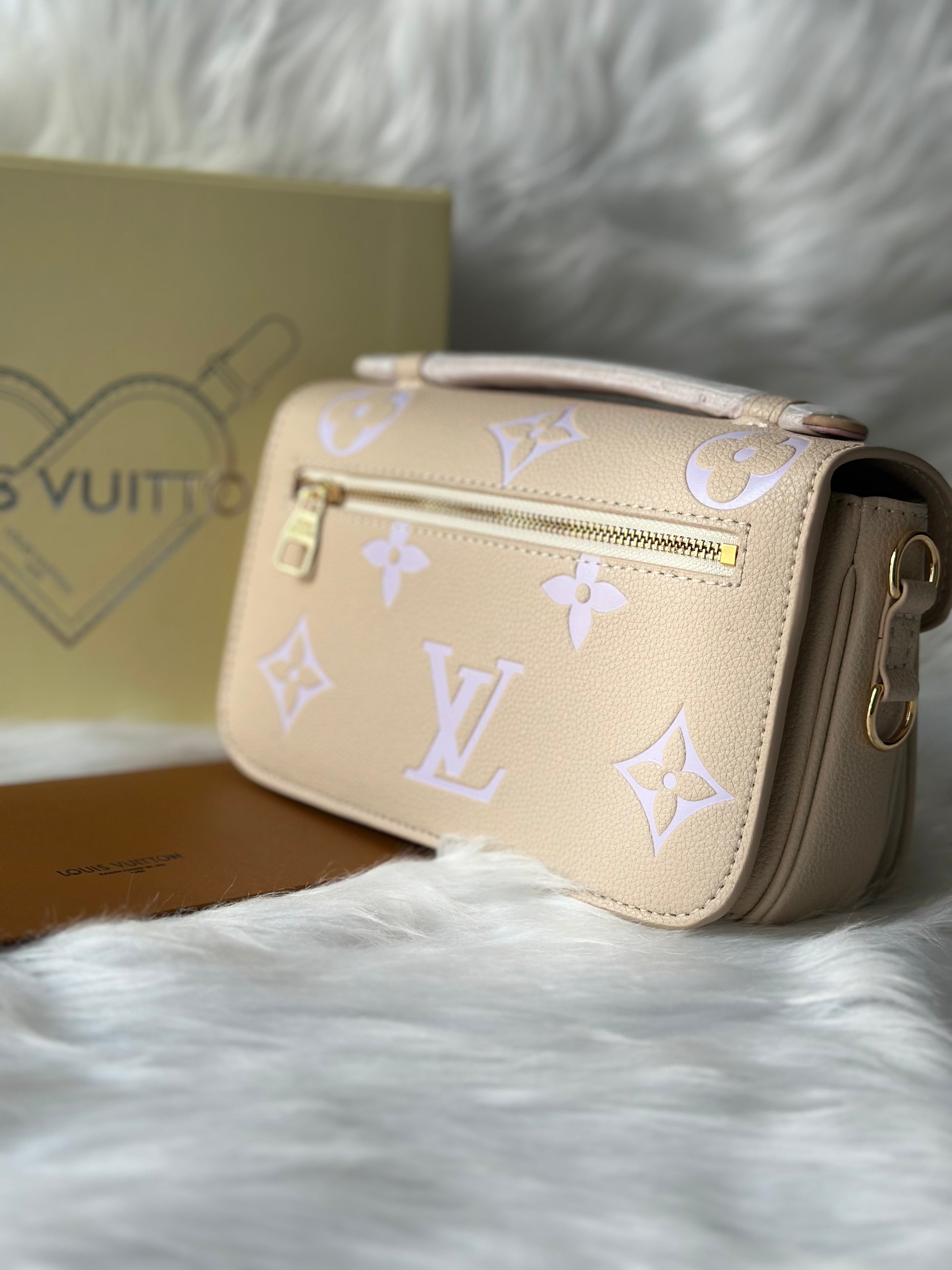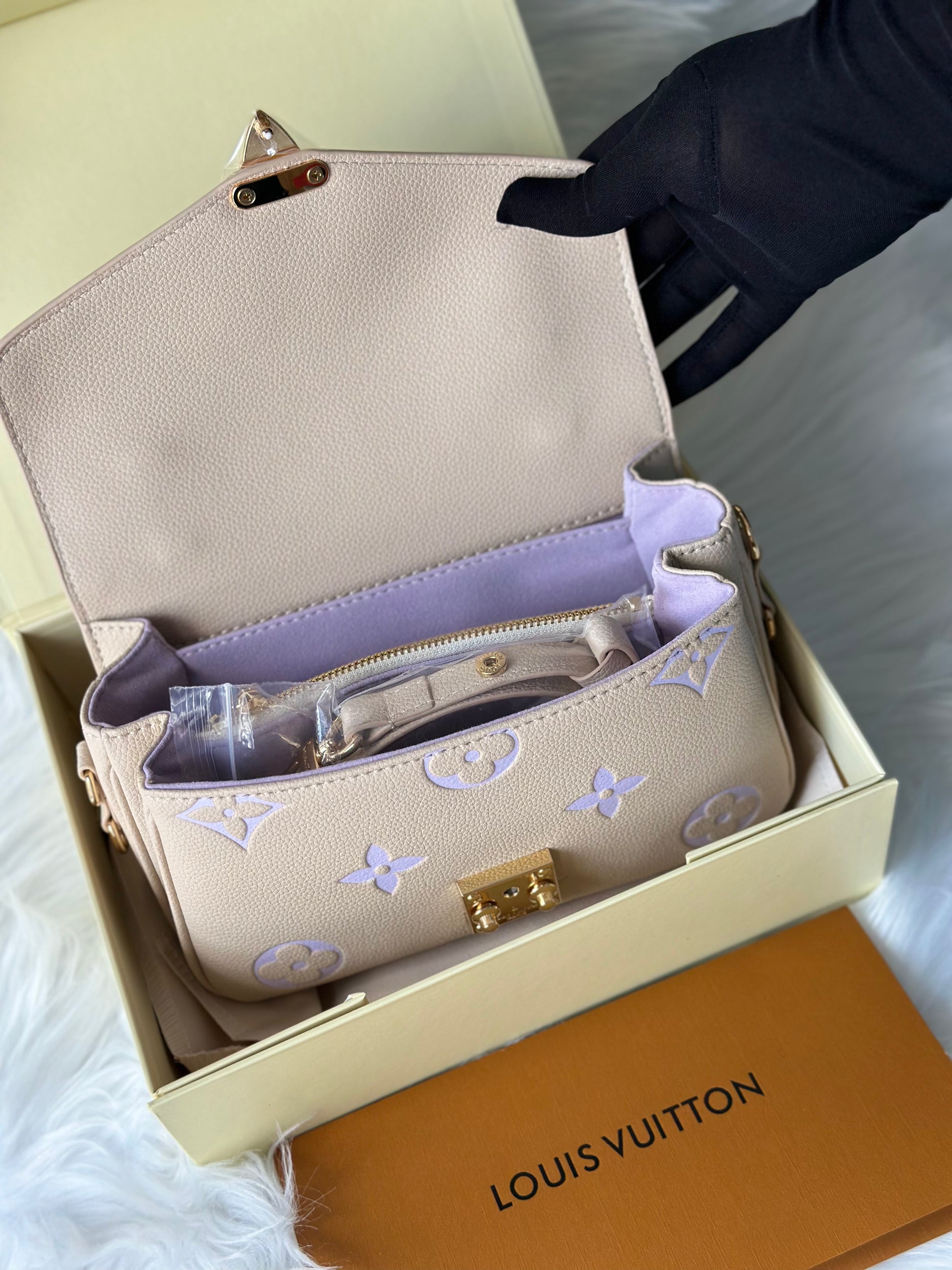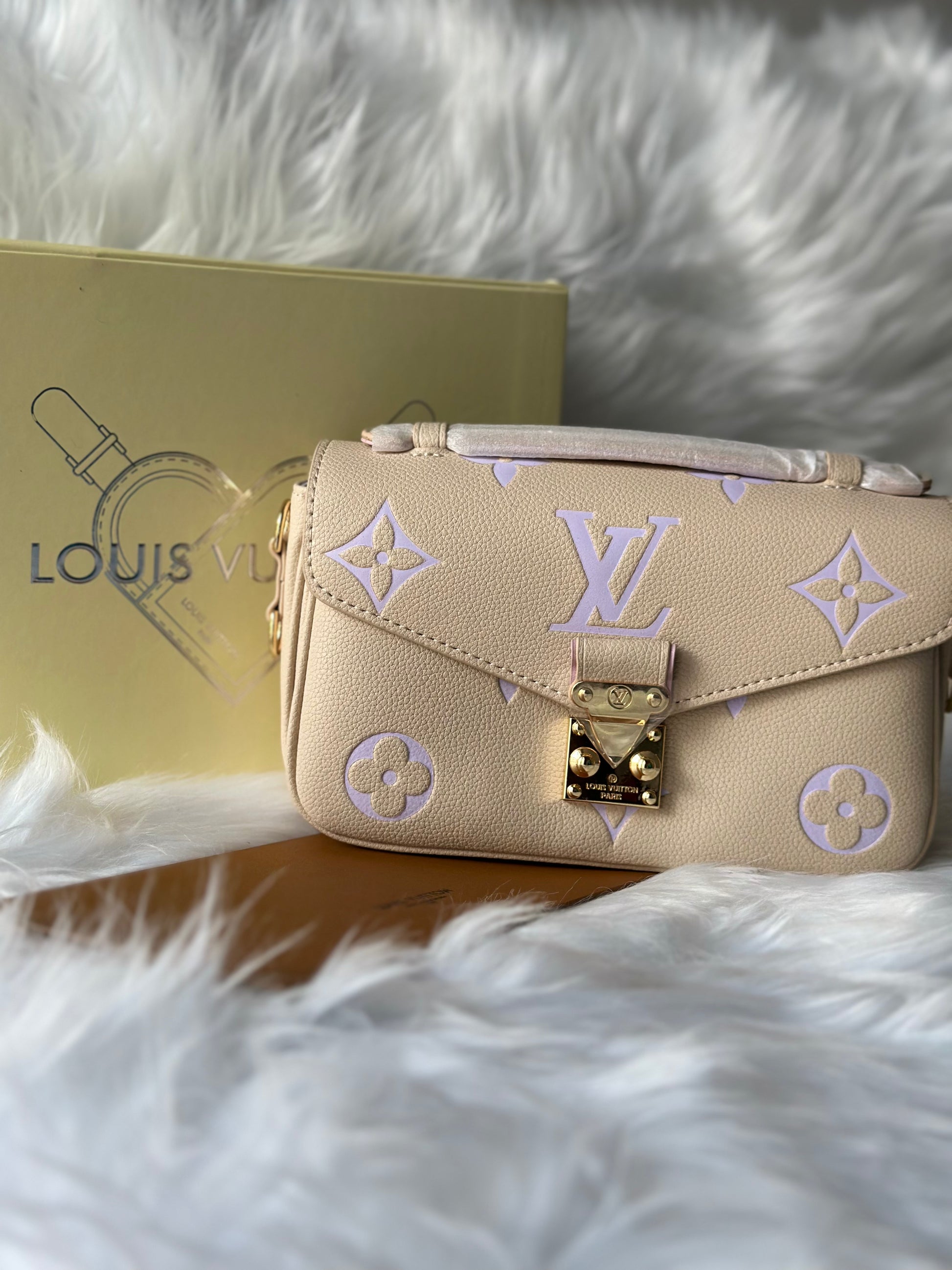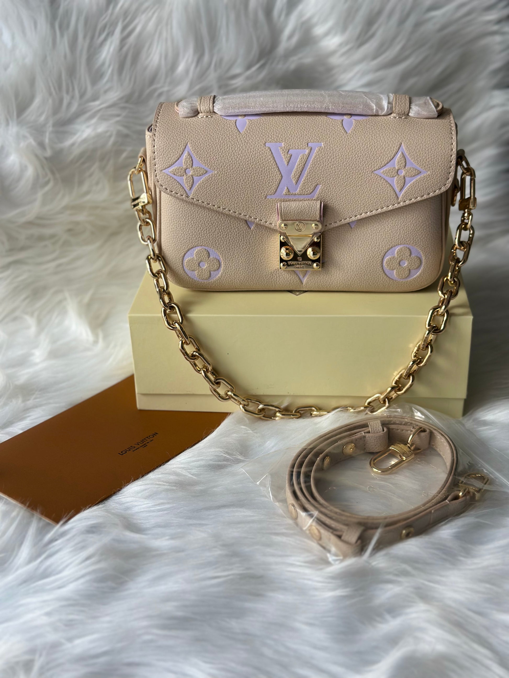 A dawn-toned statement bag. Pairs champagne-nude pebbled leather with whisper-lilac motifs, finished in polished gold hardware. Carry it three ways- top handle, on the shoulder with chain, or hands-free with the detachable leather strap.